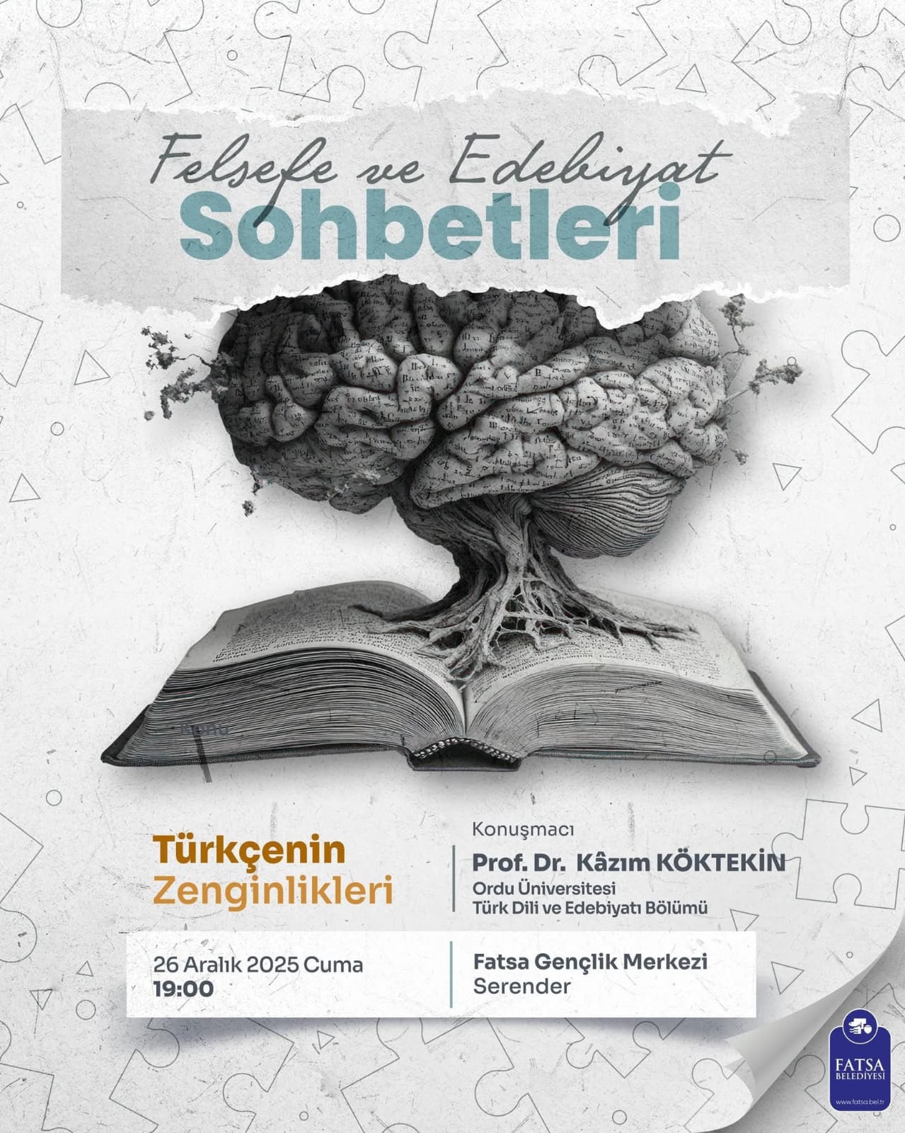 Ordu Üniversitesi Türk Dili ve Edebiyatı Bölümü Öğretim Üyesi Prof. Dr. Kazım KÖKTEKİN'in sunumuyla ve Meslek Yüksekokulumuz öğrencilerinin katılımıyla 26 Aralık 2025 Cuma Günü Fatsa Gençlik Merkezinde "Felsefe ve Edebiyat Sohbetleri" kapsamında, Türkçenin derinliklerinin ve zenginliğinin ele alındığı programda; kültür, edebiyat ve düşüncenin buluştuğu anlamlı bir söyleşi gerçekleştirildi. |